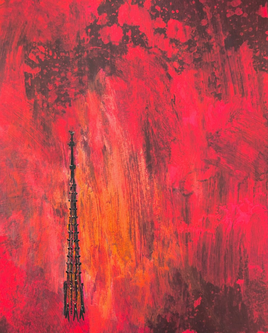 Notre Dame Cathedral by Michelle L Hofer — acrylic paint on paper, 8 x 10 inches, 2019. May 28, 2023 Lectionary Texts — Year AActs 2:1-21 or Numbers 11:24-30 • Psalm 104:24-34, 35b • 1 Corinthians 12:3b-13 or Acts 2:1-21 • John 20:19-23 or John 7:37-39 View Lectionary Image description: Set on a fluorescent red …