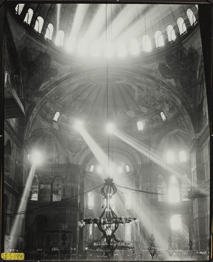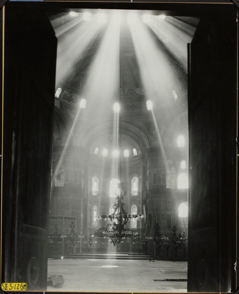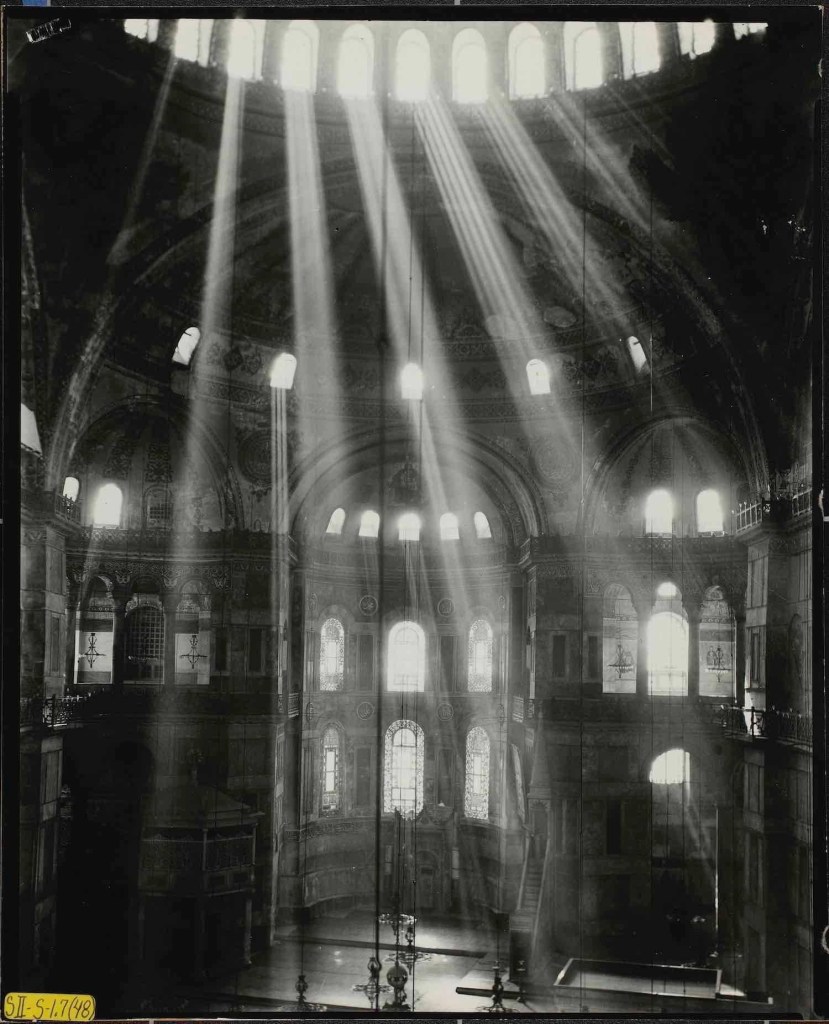 The article by John Sanidopoulos details how this concept was incorporated by the two architects hired by Byzantine ruler Justinian in building the Hagia Sophia Cathedral in Istanbul. Photos taken by Thomas Whittemore’s Byzantine Institute who uncovered and restored the original mosaics in Hagia Sophia in the 1930’s reveal the stunning light displays symbolizing the birth of Christ.