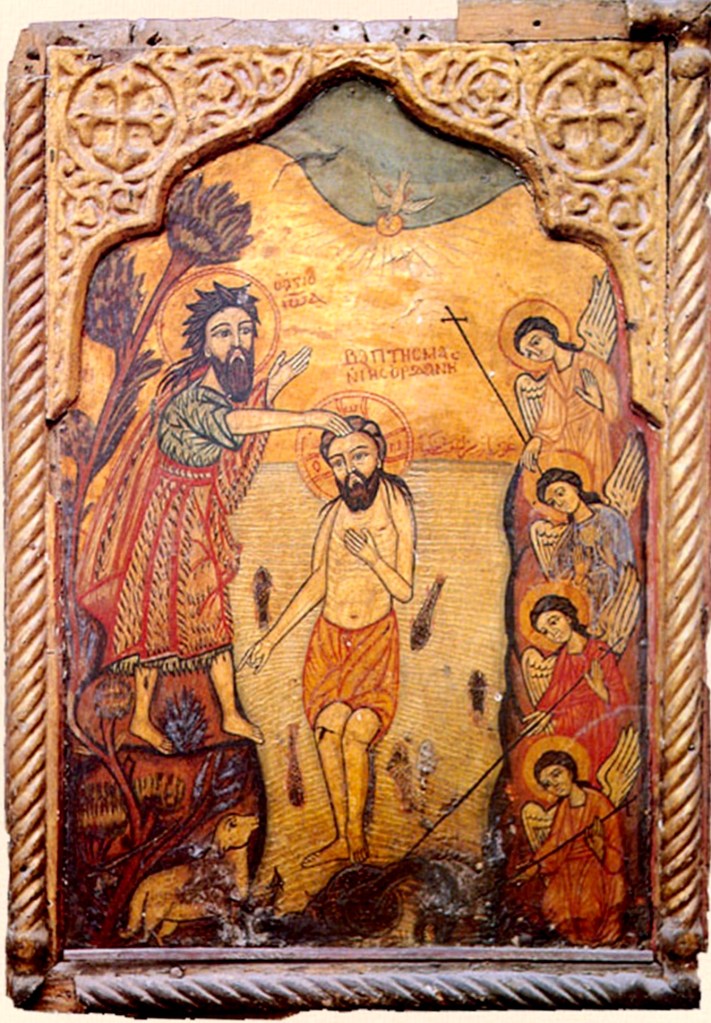 For this Sunday’s texts, I have chosen an icon from Egypt’s Coptic Christian tradition. The Copts were actually the last generation of the ancient Egyptian culture and tradition. Ancient Egypt was of course one of the most artistically sophisticated cultures the world has ever known. When the Coptic people adopted the new religion of Christianity, they were quick to develop a visual style and iteration for their new faith and became highly influential in the development of Christian art across the centuries. Coptic Christian art, taking many cues from ancient Egypt, is distinguished by simple figures with especially large wide eyes. Note how John the Baptist is posed Egyptian style one foot ahead of the other, arms extended, body half turned to the viewer. The colors are bold and of high contrast. As the tradition grew, it incorporated elements from Islamic decoration as well. The frame of this icon is a perfect example of such.