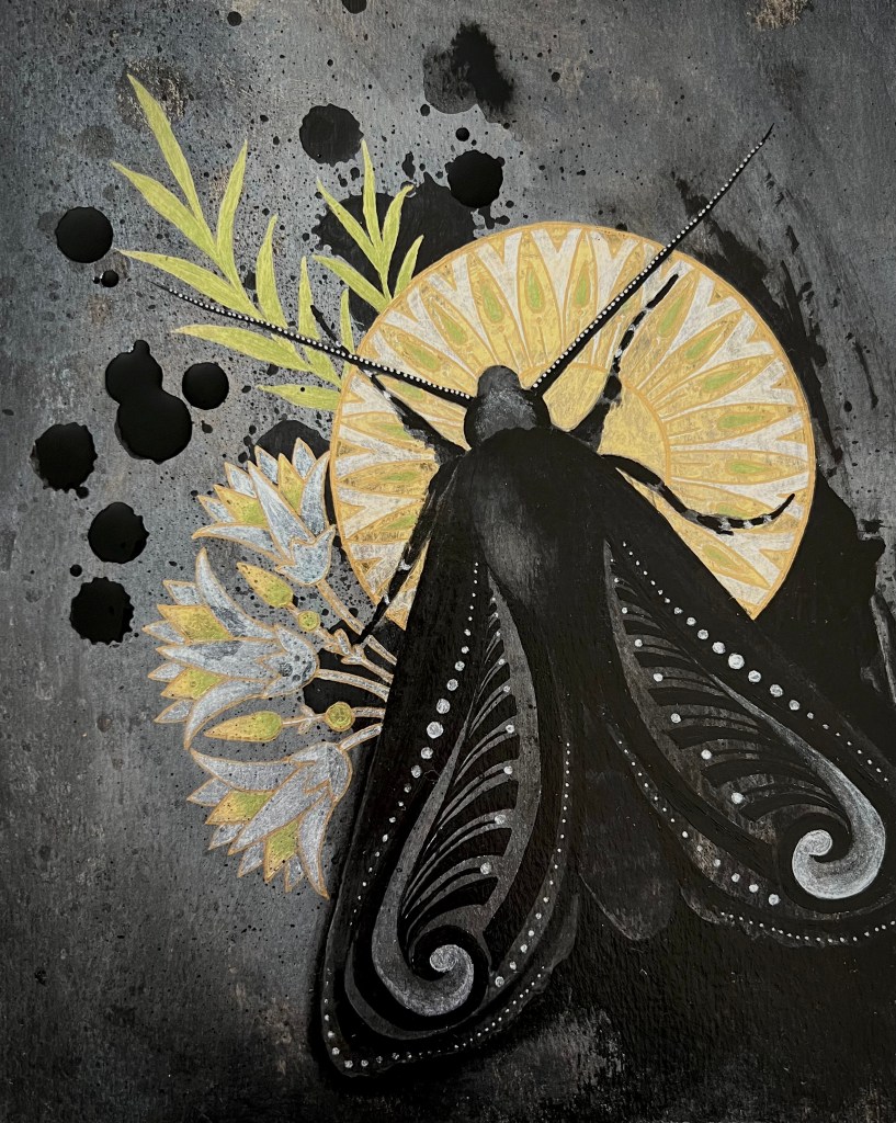 I do not remember which came to me first — an early morning vision of a great dark moth adorned in shimmery dots or my learning the moth was a symbol of resurrection among early Celtic Christians. Regardless, I let the curiosity of exploring moth as symbol guide my artistic and spiritual seeking in this Lenten season.