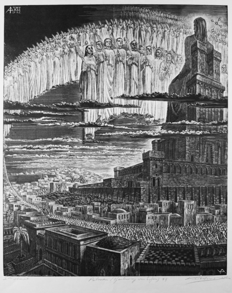 This marvelous envisioning of the Revelation text comes to us from the South American artist, Victor Delhez, a skilled engraver who served many years as a professor at the Academy of Fine Arts at the National University of Cuyo in Argentina. Inspired by his friendships with individuals among the indigenous Quechua peoples, Delhez created over 100 Gospel illustrations set in the Bolivian landscape. A Buenos Aires publisher printed an exquisitely bound Spanish Gospel volume featuring 90 of the Delhez’s images in 1944. Sometime after 1956, Delhez began working on an Apocalypse series for the Book of Revelation. Palms is one of 31 plates in that collection. If you have some spare time, I would highly recommend you view the complete set of engravings.