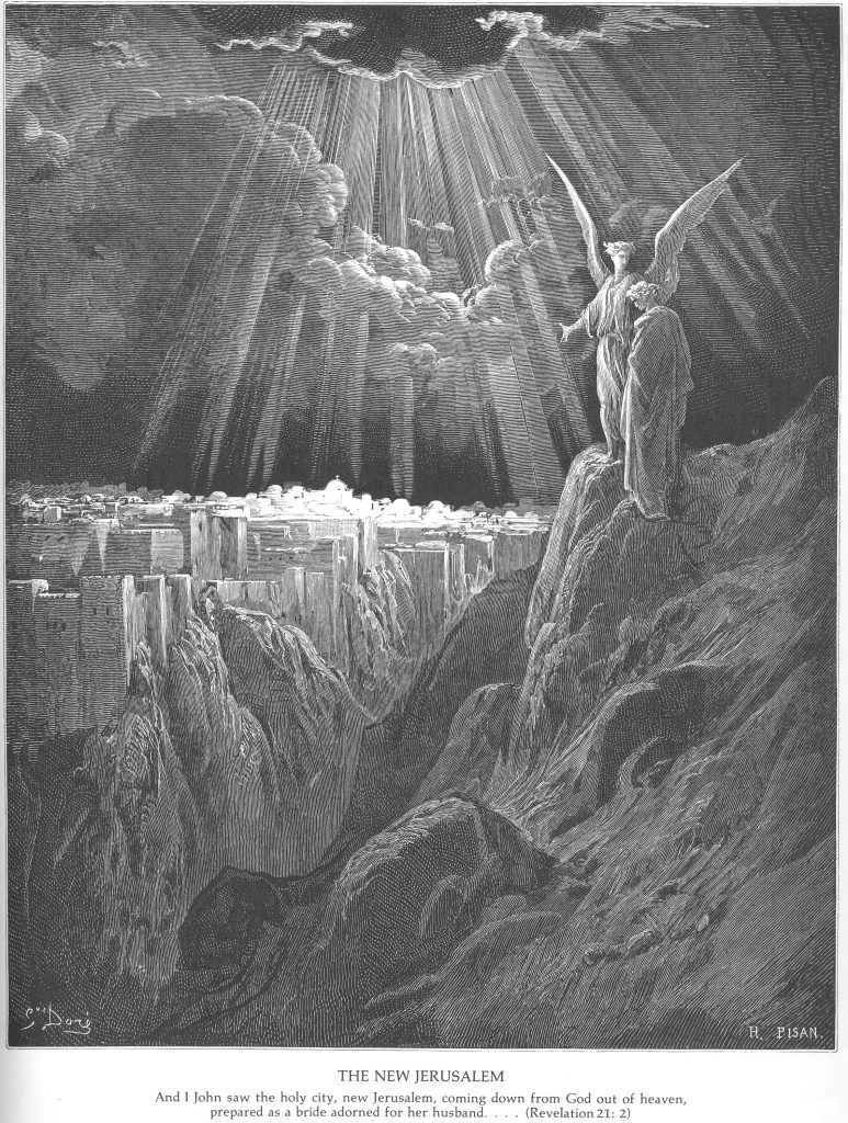 The final illustration for Doré’s Bible series is this scene… standing high on a rocky ledge, John and his angel guide overlook a massive city. Light streaming down from above through billowy clouds brilliantly illuminates the buildings at the heart of the city. A cross can be seen atop the dome at center.
