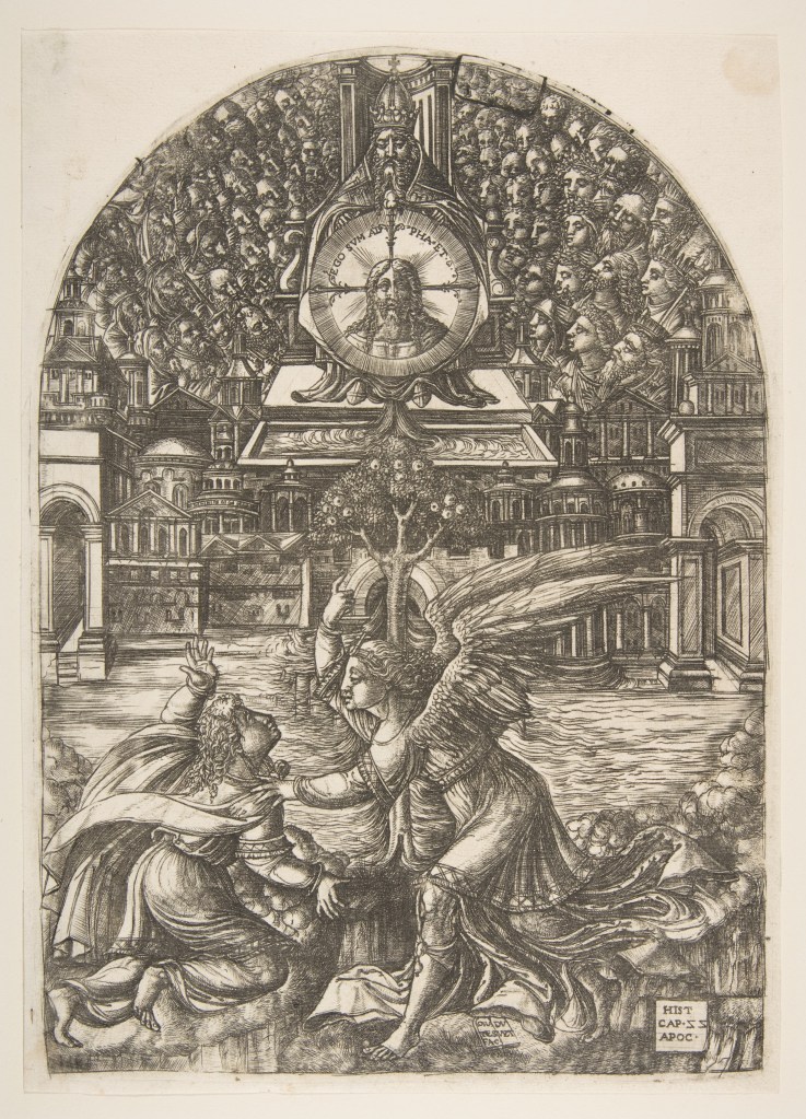 Duvet’s engraving corresponding to the Revelation passage from today’s lectionary reading depicts God on the throne atop the buildings of the New Jerusalem. God, depicted here as an older man, holds a large disk bearing the Lamb/Christ’s image. Saints and elders occupy the space surrounding the throne. We see the river emerge from under God’s garments, flow into a large rectangular pool and then out through an arch below the city filling an even larger area from which the tree of life grows up. John and the angel appear in the foreground frozen in an moment of urgency and excitement. Garments and hair billow as if there is a strong wind. While Duvet’s style clearly reflects Renaissance influence, there is a pleasing symmetry along with a skewed perspective to entire composition. This is more in keeping with Christian icon art which purposely flattens a scene to indicate a reality beyond the familiar earthly realm.
