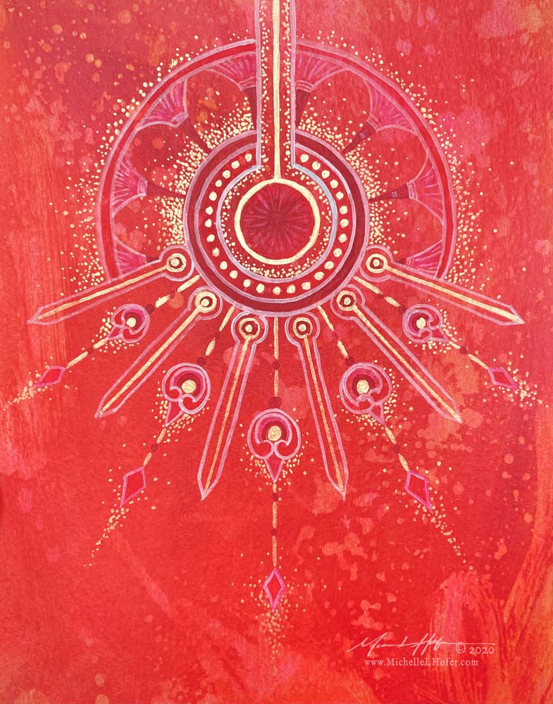My expression of this visual element is decorative and playful. Set on a flaming bright neon orange-pink background, a beam descends into a central circle shape from which arrow and sword-like rays extend. The overall design is accented boldly with gold lines and energetic dot work.