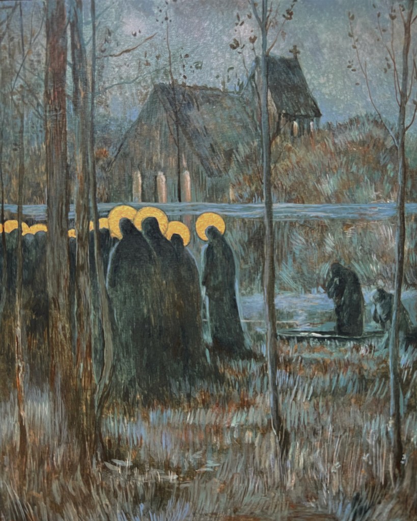 Image description: The scene features indistinct figures along a river bank across from a simple church building surrounded by large and thick shrubbery. The muted blues, greens and brown tones would indicate the time of day to be either dusk or dawn. A soft golden light glows from the church windows on the opposite shore. Two figures emerge from a small boat onto this side of the river while a group of figures draped in cloaks and bearing golden halos is present on the shore at left. Tall grass and young trees with sparse foliage fill the foreground.