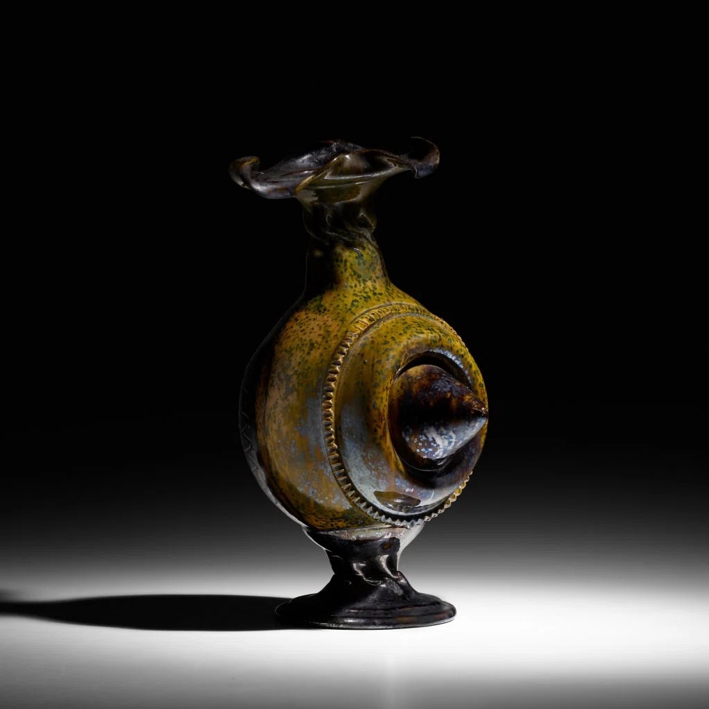 Image description: A footed ceramic clay vessel that leans slightly. The foot of the object appears to have been manually twisted as does the neck. The spherical belly of the vase features a cone shaped protrusion a slender ring of zigzag detailing. The top of the pot was perhaps twisted and then flattened into a wide shape with curled sides and a tiny opening. The glaze is a streaked warm brown on the body with green speckles while the top, neck, the cone protrusion and foot are a deeper dark brown. The entire vessel has a shimmery streaked lustre-glaze effect.