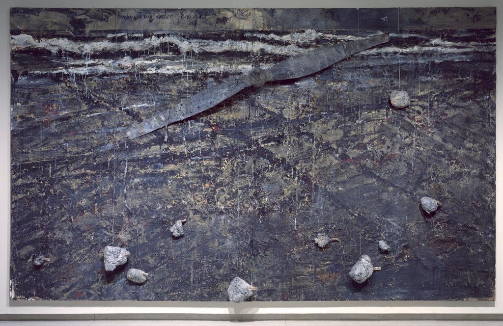 Image description: A massive canvas (over 11 x 18 feet in size) portrays a dark and brooding landscape. A grey-blue cloudy sky appears in a thin strip at the very top of the piece below which a equal strip of ocean with foamy waves meets a flat beach. The muddy looking beach is marked with ruts or tracks moving in perpendicular directions. The paint has been applied heavily and thickly with much of it also running or dripping downward. A large three-dimensional airplane propeller of two blades is attached at the shore line. It tilts slightly with the right blade higher. Both blades are bent so the ends touch the canvas. Suspended by wire cables from the top of the canvas are nine curdled lead “stones” of various sizes. These are hung at various lengths mostly near the bottom of the artwork. Each stone is labeled with a small, hand-written paper tag representing the orders of angels: angels, archangels, principalities, powers, virtues, dominions, thrones, cherubim, and seraphim.