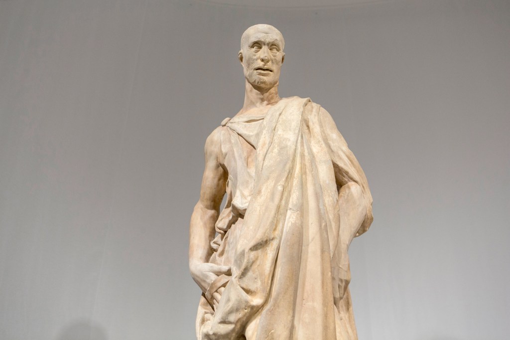 Image description: Standing with a look of exasperation, the prophet Habakkuk stares with a large open mouth as if he is about to speak. Dressed in a toga-like garment with one arm and shoulder exposed, we glimpse a thin yet slightly muscular man. One hand is casually tucked under the strap of a scroll while the other dangles limply in the folds of his robe.