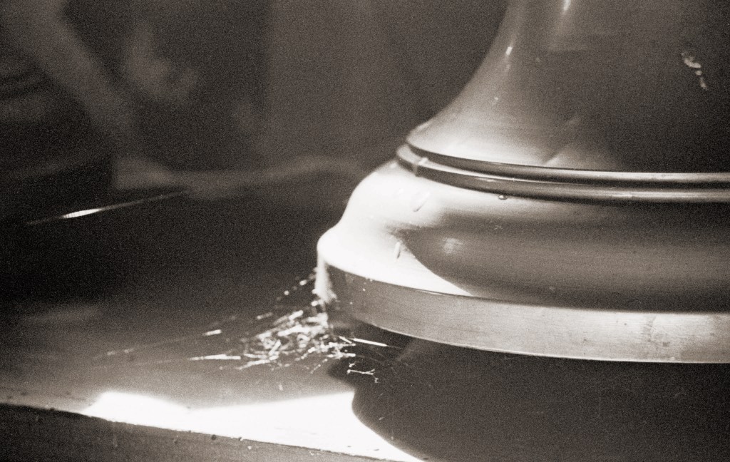 Image description: Closeup black and white photograph of the base of a brass candlestick on a church altar. Sunlight from a window above the altar hits the edge of the candlestick base and the table. Though mostly out of focus, a grid of cobwebs shimmers in the light between the candlestick and the table surface.