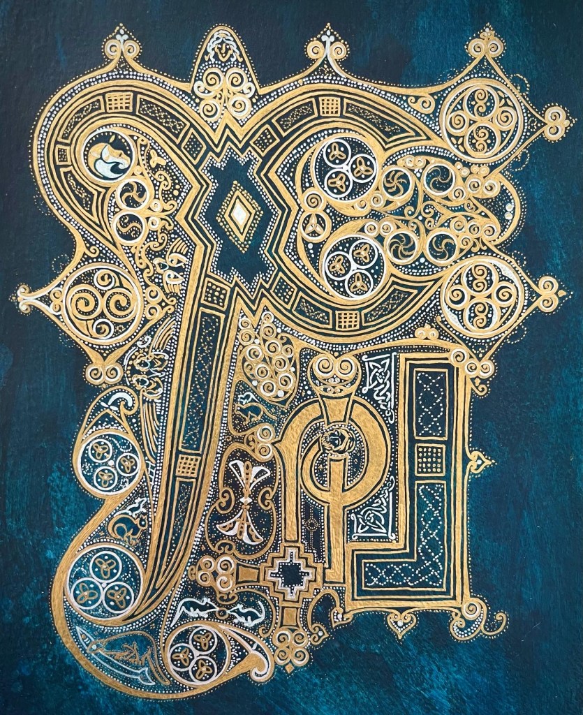 Image description: A decorative presentation of the Greek letters X P I spelling Christi or Christ. A variation on the design found in the Chi Rho Page from the illuminated Celtic Gospels, The Book of Kells. Space around and between the letters is filled with spiral designs, Celtic knot work, angels, moths, an otter with a fish, several cats and mice playing together and the face of Christ. A diamond symbol for Christ is the focal point of the piece and appears at the cross-section of the X. The design has been rendered in mostly metallic gold and some silver on a deep blue background.