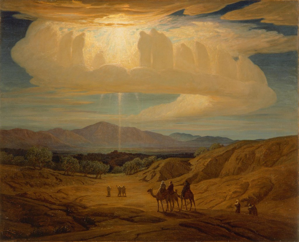 Image description: A realistic depiction of a vast landscape and sky. The foreground is desert, but in the distance are olive trees and a lush valley at the foot of a mountain range. The village of Bethlehem sits atop a darkened hill just beyond the grove of trees. From a break in the clouds near the upper edge of the paintings shines the light of the star in expanding rays. The center ray ends at Bethlehem on the hill. The wise men (riding camels) and two small groups of travelers gaze at the bright star a few have their arms raised toward the sky in gestures of amazement. Just below the star burst is a second bank of clouds upon which the forms of heavenly figures can be seen. These appear to be looking down at Bethlehem below.