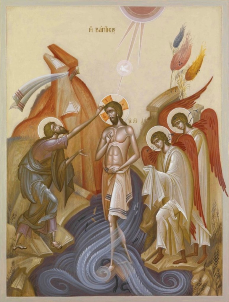 Image description: A traditionally painted icon with modern characteristics, Jesus stands in the Jordan River. With his left hand he clutches the cloth draped about his waist and with the right hand Jesus gestures a blessing towards himself. John the Baptist is seen crouching on the left bank of the river. With his outstretched right arm, John touches the top of Christ’s head. John’s gaze is directed upward toward the half-circle mandorla (opening of heaven) at the top of the image. John holds his left hand in an open gesture of receiving. The dove of the Spirit descends along one of the rays extending from the mandorla. Two angels stand with heads bowed and covered hands (an ancient practice of covering dirty calloused hands when approaching royalty) on the right riverbank. Colorful desert shrubbery accents the hilltop behind the angels. A garment wraps around the hill behind John flaps in the wind. In the waters of the Jordan are two schools of fish. Below Jesus’ feet are the gates of hell and a dark serpent being crushed beneath them.