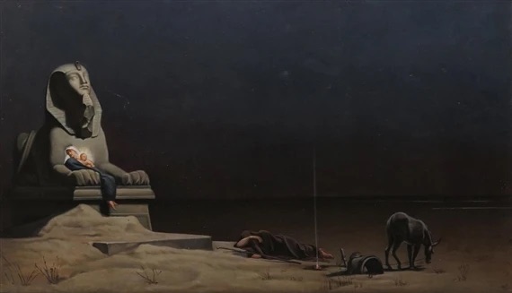 So Joseph got up in the middle of the night; he bundled up Mary and Jesus, and they left for Egypt. — Matthew 2:13-14Romantic as it is, artist Luc Olivier Merson provides for us a welcome variation on the classic Western depiction of Joseph leading the donkey carrying Mary and Jesus on their late night trip from Israel to Egypt. Merson was intrigued enough with this subject that he painted four different versions of it (two more are featured below) — each differing in the lighting.